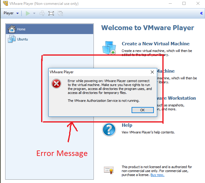 This is an error we get sometimes in VMware. The error message is "VMware workstation can not connect to the virtual machine. Make sure you have rights to run the program, access all directories the program uses, and access all the directories for temporary files. The VMware authorization service is not running".